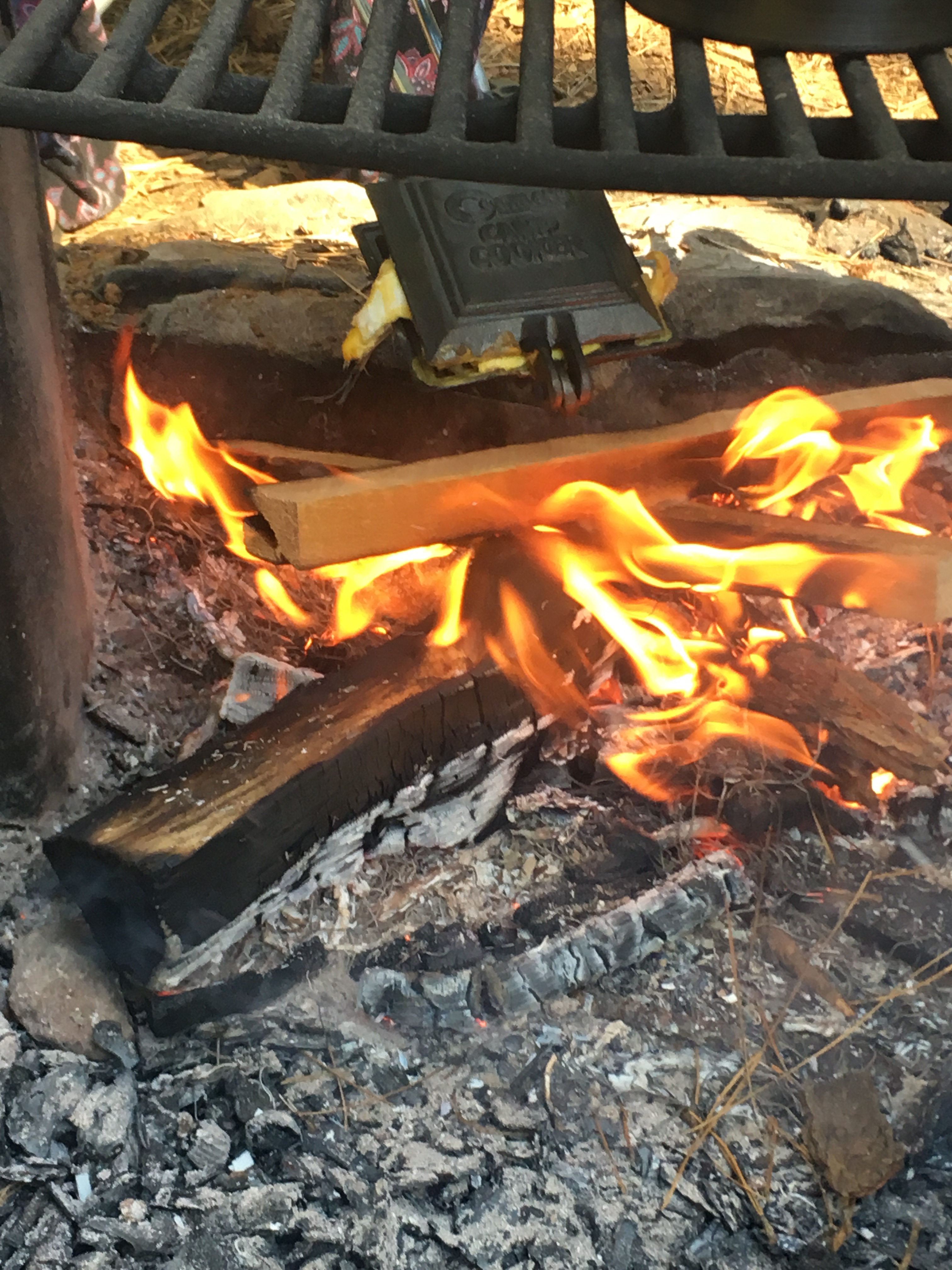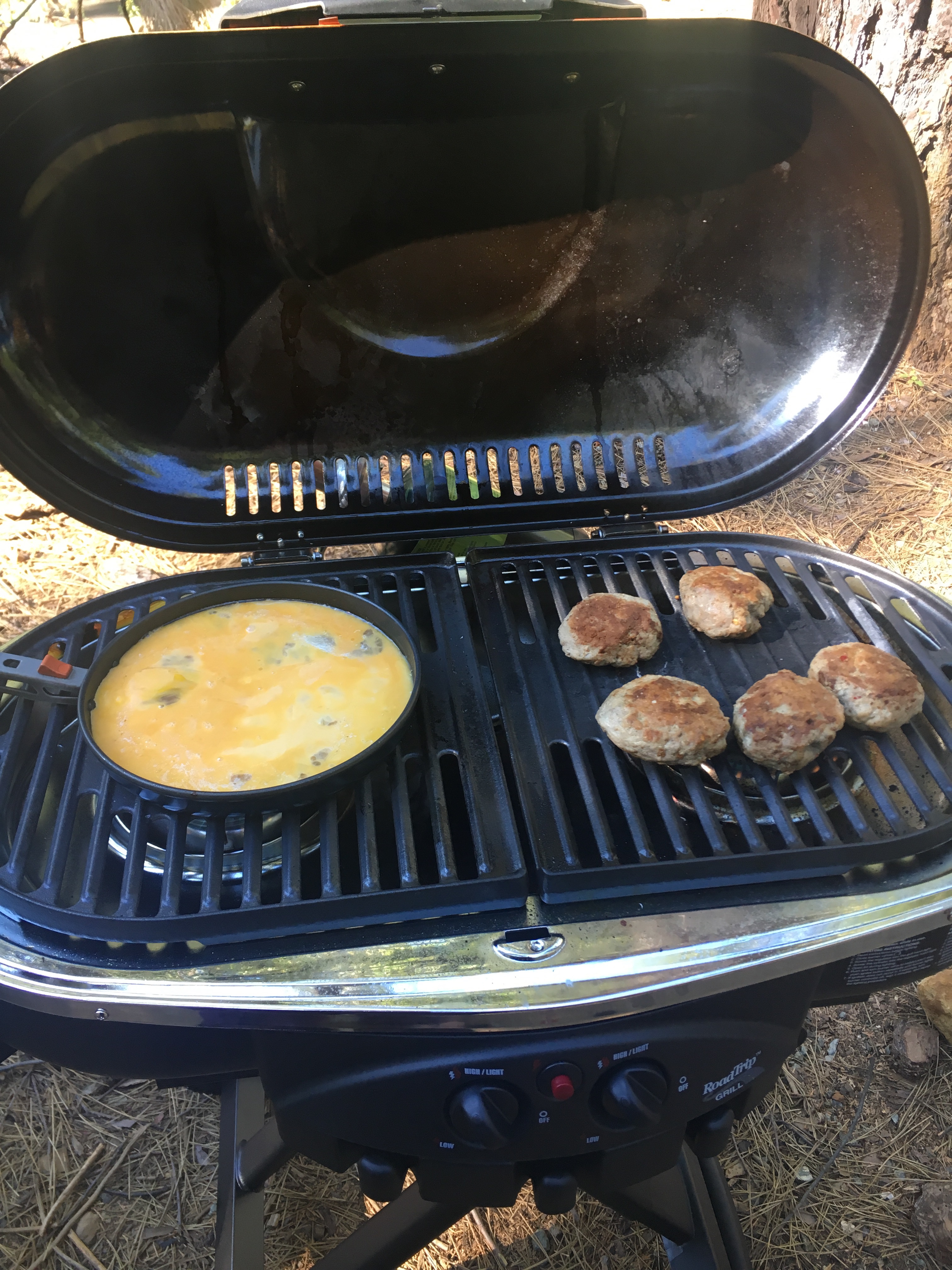 - Scramble eggs in a pan either on campfire or propane grill if you have one