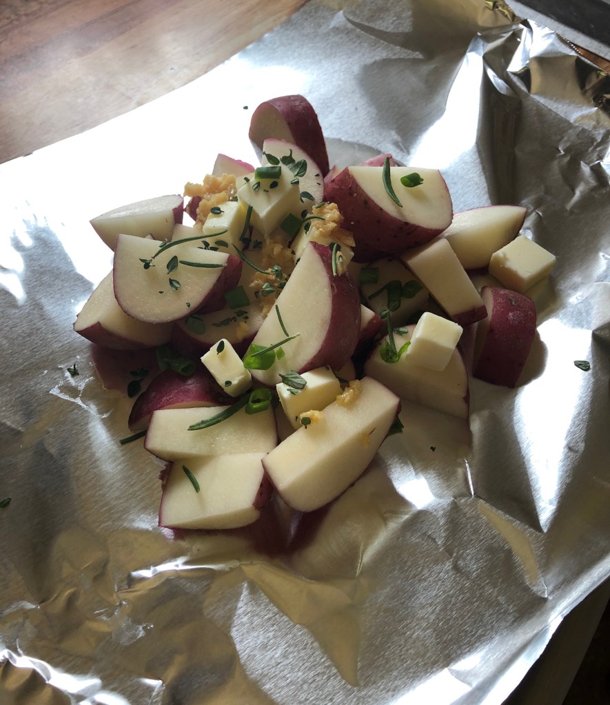 - Align potatoes into the center of the foil and place the small cubes of butter evenly on top of potatoes