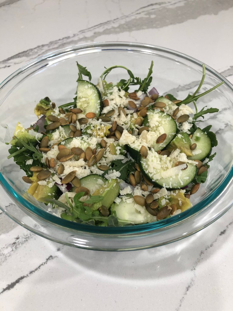 2) Put arugula in a bowl. Add cubed avocado, sliced red onions, sliced cucumbers, toasted pepitas and shaved Parmesan cheese