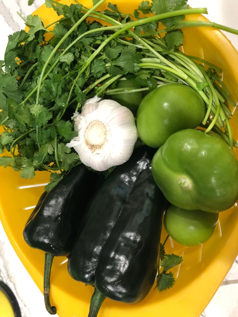 - Add chicken broth, cooked chicken, beans, corn, and extra verde (if have)