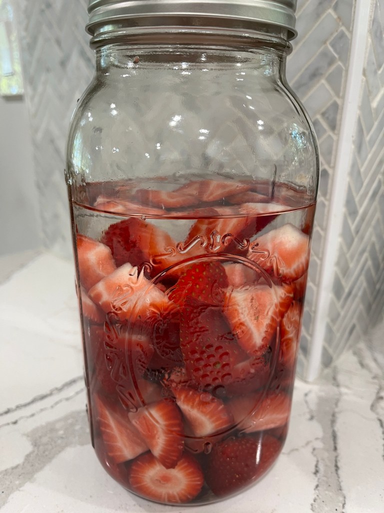 1. Put 4 cups of strawberries, tops removed and sliced, in a large mason jar.