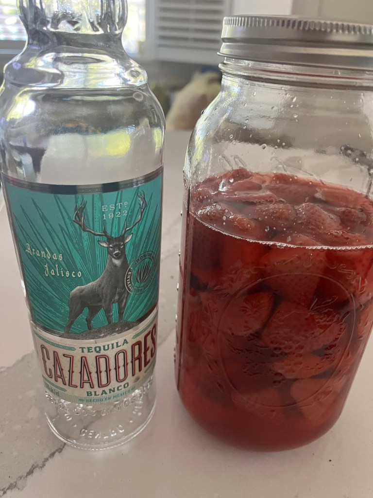 5. Using a strainer and funnel, pour tequila through strainer into the empty tequila bottle and discard strawberries